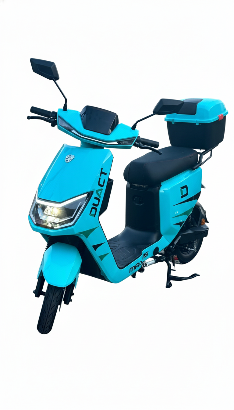 A DUACT 1000W traz motor de 1000W, autonomia de 60 a 70 km, recarga em até 6 horas na tomada comum e é classificada como autopropelida, ou seja, dispensa CNH e emplacamento em áreas urbanas. Conta ainda com painel digital, farol e setas em LED, alarme e ignição por NFC, baú de 32L resistente à água, entrada USB e suporta até 160 kg, acomodando duas pessoas com conforto.